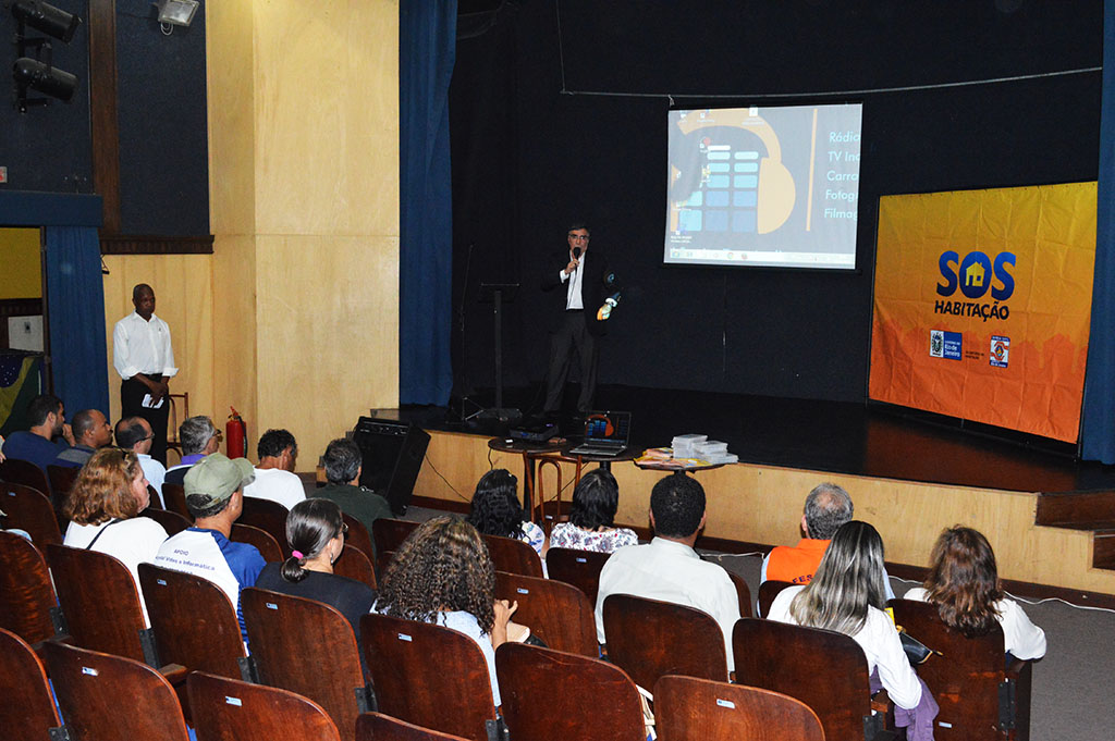 Teresópolis, 17 de novembro de 2015 – As Secretarias de Estado de Habitação e de Defesa Civil apresentaram nesta segunda-feira, 16, no Teatro Municipal, a palestra ‘Morar com Segurança’, que integra o programa ‘SOS Habitação’. O programa é voltado para as orientações sobre ocupação do solo e como proceder em situações de deslizamentos e inundações. O público, formado por líderes comunitários, como presidentes de associações de moradores, recebeu ainda cartilhas e um videoaula reproduzindo a palestra para replicar as informações em suas comunidades.